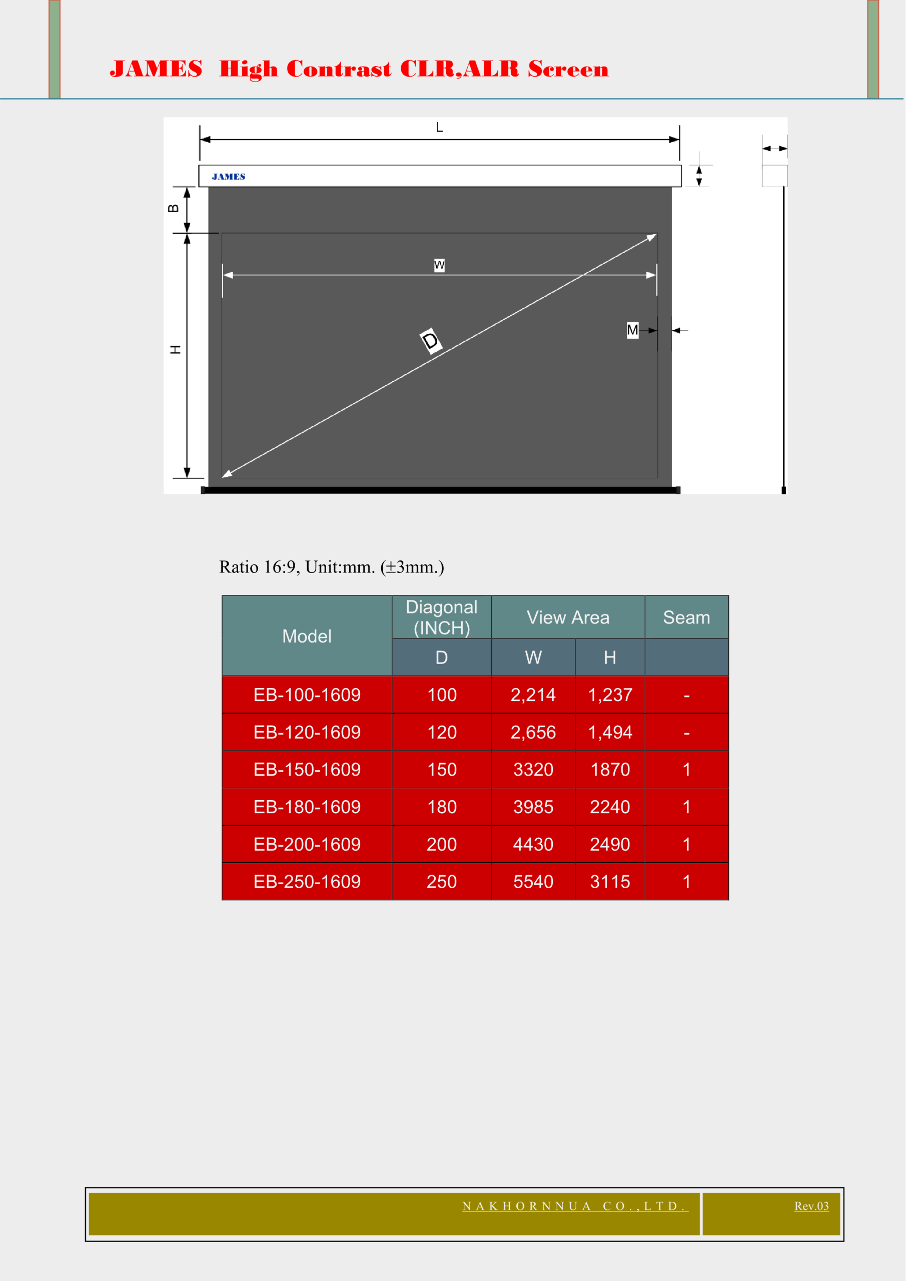 จอรับภาพแบบ Fixed Frame ความสว่างสูง Gain 12 "JAMES" 100-300 นิ้ว,16:9,16:10